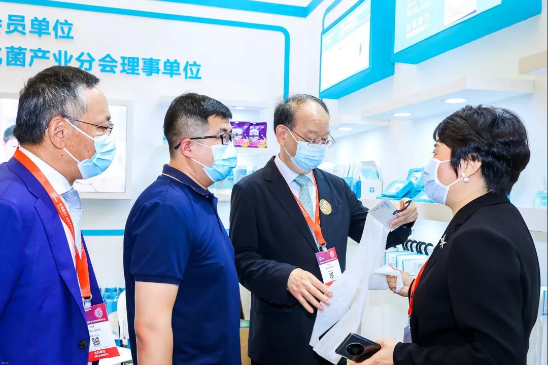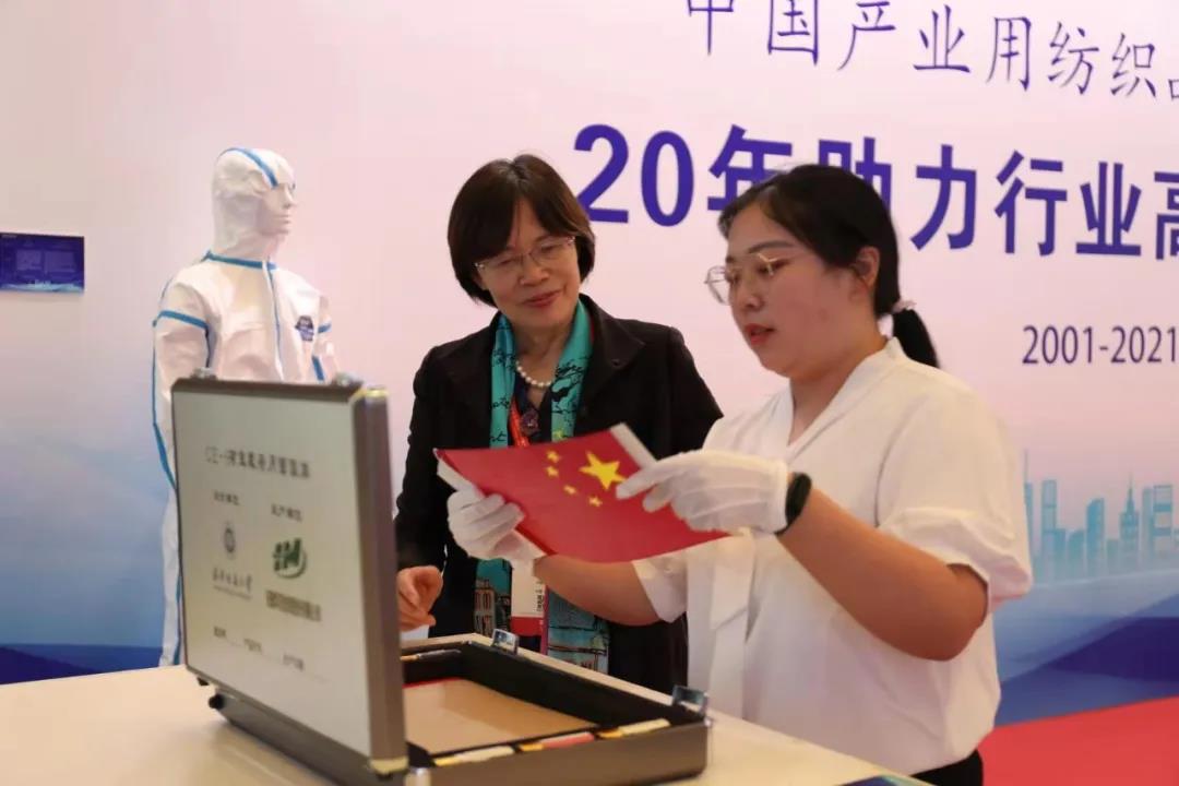 本屆CINTE21特設創新產品展示區,以“20年助力行業高質量發展”為主題,以“協會成立20年回顧篇”“行業科技成果篇”“行業綠色發展篇”三大篇章,回顧了產業用紡織品行業20年的發展歷程,展現了產業用紡織品在醫療衛生、環境保護、土工建筑、應急安防、海洋工程、航空航天和國防軍工等領域的應用,展示了非織造產業的綠色發展成果。展區負責人詳細地向到訪人員介紹了陳列的高新技術產品,包括麻竹纖維車門內板、嫦娥五號任務月面展示國旗、單兵戰術款全防護防彈衣、BW090401型射線防護服、人造血管等產品。
