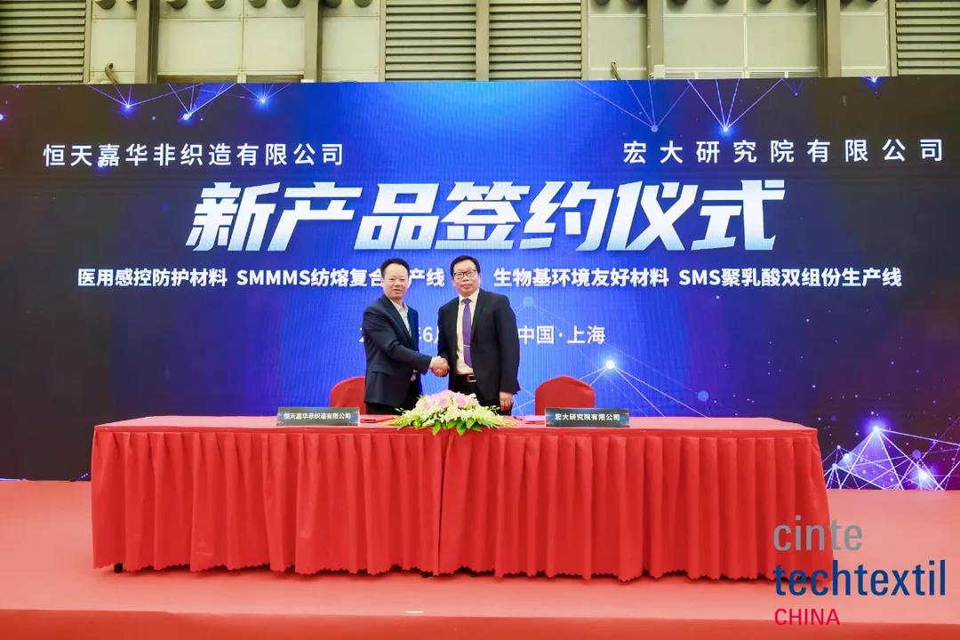 會上還舉辦了3個簽約儀式,分別為:湖北雙森汽車新材料有限公司與宏大進行了“輕量化衛生護理材料 SSXMMS紡熔復合生產線”簽約;恒天嘉華非織造有限公司與宏大進行了“醫用感控防護材料SMMMS紡熔復合生產線、生物基環境友好材料、SMS聚乳酸雙組份生產線”簽約;Soar Canada Material Ltd.與宏大進行了“加拿大索爾國際醫衛材料一期項目”簽約。