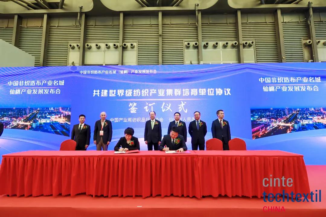發布會上舉行了仙桃市彭場鎮人民政府與湖北新鑫無紡布有限公司、廣東茂名石化實華股份有限公司簽約儀式,仙桃市胡場鎮人民政府與武漢市川田衛生用品有限公司簽約儀式。李桂梅與仙桃市委常委、統戰部長胡常偉簽訂培育共建“世界級紡織產業集群培育單位”協議書。高勇、孫瑞哲、許坤元、陳偉康、徐迎新見證簽約儀式。