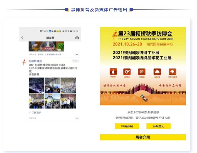 ▼2021秋季柯橋紡機及印花展全新規(guī)劃營銷推廣計劃。針對線上線下各專業(yè)及大眾領域渠道進行細化型擴展,多維度開展精準全方位市場營銷。