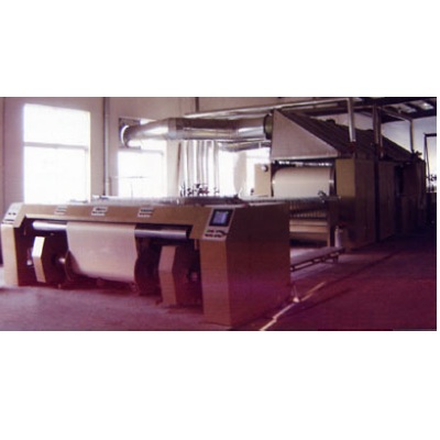 一、 概述 本系列漿紗機(jī)應(yīng)用于紡織工業(yè)前織準(zhǔn)備工程,完成上漿工序。同時(shí)適應(yīng)有梭及及無梭織機(jī)的配套需要,滿足淀粉漿、化學(xué)漿、混合漿對(duì)純棉、麻、及其混紡織物化纖及其混紡織物、化纖及其混紡物的經(jīng)紗上漿。 將成批整經(jīng)經(jīng)軸的細(xì)紗在本機(jī)上進(jìn)行合并、上漿、烘干、上蠟、分紗、計(jì)長,并按工藝規(guī)定的匹長打墨印,再以恒定的張力卷成織軸后,供給后道穿綜織造工序。 本系列漿紗機(jī)可組合8烘筒、10烘筒、12烘筒式大卷裝紗機(jī)(見圖)。以滿足不同用戶、不同織物品種、不同上漿工藝的要求。 本系列漿紗機(jī)由以下幾部分組成:車頭、漿槽、全烘筒烘房、軸架、電柜。 二、整機(jī)主要技術(shù)參數(shù) A,車頭: 1、適應(yīng)范圍:8.5-90Tex棉、麻及其混紡織物、化纖及其混紡物等短纖維經(jīng)紗。 2、幅寬系列:2000mm、2800mm、3300mm、3600mm。 3、機(jī)器速度:1m/min-100m/min。 4、織軸卷裝:Ф800。Ф1016 5、裝機(jī)容量:200型全烘筒大卷裝漿紗機(jī)40KW。 280型全烘筒大卷裝漿紗機(jī)50KW。 6、外型尺寸:200型全烘筒大卷裝漿紗機(jī)20800mmх5200mmх2950mm。 280型全烘筒大卷裝漿紗機(jī)24500mmх5200mmх2950mm。 7、機(jī)器重量:200型全烘筒大卷裝漿紗機(jī)20T,280型全烘筒大卷裝漿紗機(jī)21T。 8、卷繞張力:0—7000N(無級(jí)設(shè)定,自動(dòng)跟隨) 9、分絞區(qū)張力:0—60000N(無級(jí)設(shè)定,自動(dòng)跟隨) 整機(jī)車頭結(jié)構(gòu)緊湊,機(jī)身左中右都設(shè)有操作按鈕,方便操作。電動(dòng)移動(dòng)拍合箱,氣動(dòng)上落軸,自動(dòng)對(duì)位,與織軸尺寸無關(guān)。 30KW電機(jī)通過齒輪傳動(dòng)箱減速后通過傳動(dòng)軸鏈條傳動(dòng)織軸,變頻器對(duì)卷繞張力自動(dòng)跟隨。與織軸卷徑個(gè)變化無關(guān)。 15KW電機(jī)通過減速機(jī)后經(jīng)XP1由鏈條傳動(dòng)拽引輥。XP1通過調(diào)整拽引輥速度來達(dá)到調(diào)整干區(qū)張力的目的。拽引輥裝置配置一根拽引棍,直徑Ф250mm,包覆邵氏70度軟橡膠,一根測(cè)長加壓棍,直徑Ф160mm,氣動(dòng)上下,一端裝有旋轉(zhuǎn)編碼器,用以測(cè)量經(jīng)紗長度。 B,上蠟裝置: 配置一套上蠟裝置,上蠟輥直徑Ф100mm,表面鍍硬鉻,由一根直徑Ф150mm的導(dǎo)紗輥通過減速箱和鏈條來傳動(dòng)上蠟輥,使得上蠟輥的表面速度與紗線速度保持了一個(gè)固定的比例關(guān)系。預(yù)融斗與蠟槽內(nèi)設(shè)有不銹鋼蒸氣管道,用于間接加熱。 C,漿槽: 雙漿槽,每只漿槽的壓漿形式都為雙浸四壓,主壓漿輥?zhàn)畲髩簼{為40KN。漿槽槽體采用夾層結(jié)構(gòu)并分為主漿槽與輔漿槽,內(nèi)外層都為不銹鋼結(jié)構(gòu),輔助漿槽設(shè)有液面控制器,通過氣動(dòng)球閥能自動(dòng)補(bǔ)充新漿至輔助漿槽中。主漿槽設(shè)有液面調(diào)節(jié)裝置,可預(yù)設(shè)主漿槽的液面高度。主輔漿槽內(nèi)均設(shè)有不銹鋼魚鱗管進(jìn)行間接加熱,夾層用以間接加熱和保溫。 D,烘燥裝置: 有平型和高架對(duì)角兩種結(jié)構(gòu),最多可以分為進(jìn)行四分層烘燥,該烘燥部件由12只直徑Ф800mm的烘筒組成,其中有四只涂聚四氟乙烯,分成三個(gè)獨(dú)立組件。 E,軸架: 實(shí)用整經(jīng)軸數(shù):20只 經(jīng)軸盤片直徑:Ф800mm—Ф1000mm 經(jīng)紗寬度:1400mm—1800mm 鋼架結(jié)構(gòu),10排,雙層,固定形式。 整經(jīng)軸兩端的軸承裝在可調(diào)支撐座上,通過手輪和螺紋可對(duì)兩邊軸襯進(jìn)行精細(xì)調(diào)節(jié)。在整經(jīng)軸架的右測(cè)安裝有氣動(dòng)抱閘裝置,該氣動(dòng)裝置由制動(dòng)氣缸,剎車帶,能預(yù)設(shè)制動(dòng)力的制動(dòng)杠桿,連接退繞張力控制器的氣動(dòng)管線組成。 在兩臺(tái)漿槽的后側(cè)分別安裝了一套退繞張力測(cè)量裝置,用以測(cè)量經(jīng)紗退繞張力,測(cè)量范圍:0—3000N。測(cè)量系統(tǒng)為一個(gè)固定的導(dǎo)輥,其一端裝有張力傳感器,通過張力傳感器來直接測(cè)量片紗的張力,測(cè)量信號(hào)通過張力變送器處理后送給PLC與設(shè)定值進(jìn)行比較,再由PLC根據(jù)比較結(jié)果通過電氣比例閥來直接控制退繞制動(dòng)氣壓,從而保證了與經(jīng)軸直徑變化無關(guān)和恒張力退繞效果。該裝置也能手動(dòng)控制,用以模擬相關(guān)的退繞狀態(tài),以獲取最佳的退繞設(shè)定數(shù)據(jù)。制動(dòng)氣壓壓力范圍為0—0.6MPA。 F,電控與氣動(dòng) 本機(jī)電氣設(shè)計(jì)可靠,合理。在實(shí)際工作過程中,人機(jī)工作界面設(shè)計(jì)非常友好,操作也很簡易,所有控制數(shù)據(jù)如:匹長,匹數(shù),車速,退繞張力控制形式,制動(dòng)力的大小,壓漿力控制形式,大小,繞卷張力大小,溫度控制模式,大小等數(shù)據(jù)都是從人機(jī)界面上輸入,并與實(shí)際工作情況相對(duì)照。在設(shè)備發(fā)生故障時(shí),在界面上自動(dòng)記錄故障與狀態(tài)信息。比傳統(tǒng)設(shè)備先進(jìn)的是所有質(zhì)控點(diǎn)的數(shù)據(jù)都是直接監(jiān)控,并以數(shù)字形式輸入和輸出,以設(shè)定后自動(dòng)跟隨的模式徹底消除了過去那種憑擋車工的感覺與經(jīng)驗(yàn)來調(diào)整設(shè)備的操作模式。